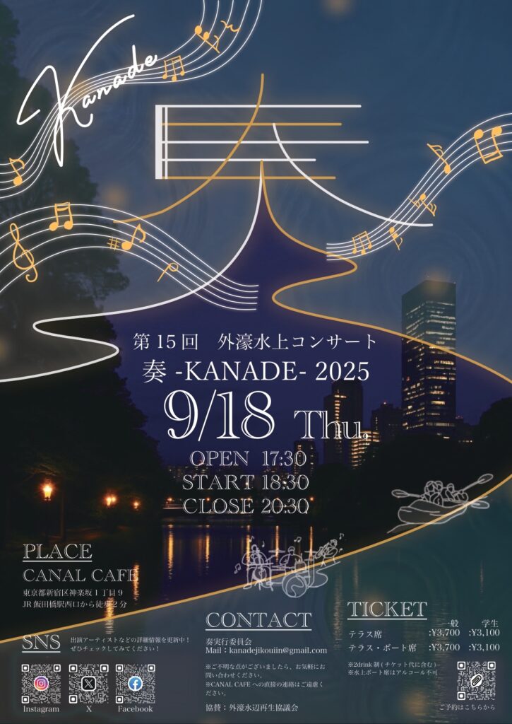 外濠市民塾の学生メンバーが運営の補助をおこなっている、第15 回外濠水上コンサート「奏-KANADE-2025」が開催されます。