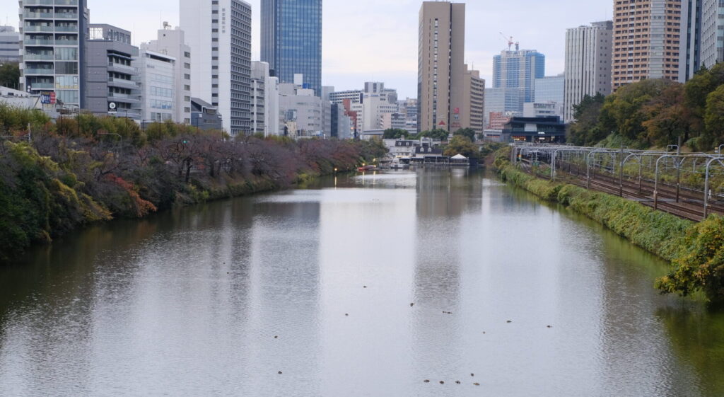 外濠は江戸城の東側、千代田区役所近くの雉子橋に始まり、日本橋川を東へ常盤橋へ、現在の外堀通りを南下して東京駅八重洲口を通り、新橋駅付近で西へ向きを変え、東京メトロ銀座線に沿って虎ノ門から赤坂見附に至ります。ここからは現在も水がある弁慶濠、JR中央線に沿って四ツ谷から飯田橋へ、この付近で神田川と合流し、御茶ノ水から東へ浅草橋に至ります。延長14㎞の長大な濠でした。